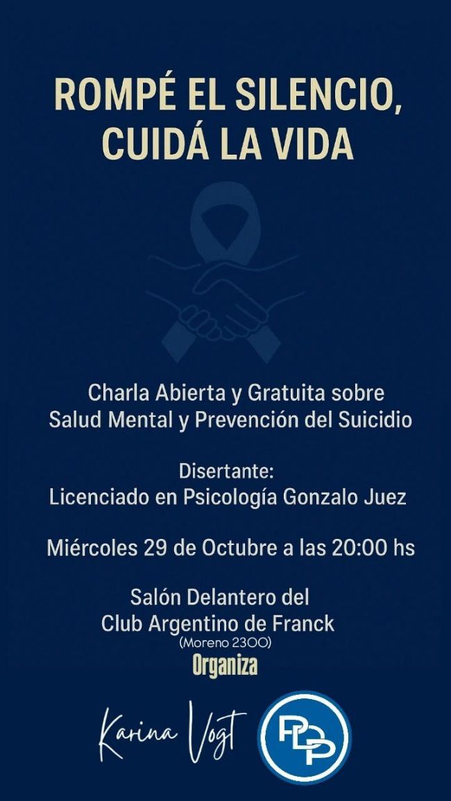 Es el título de la charla abierta y gratuita sobre salud mental y prevención del suicidio que se llevará a cargo hoy a las 20 hs. en el salón del Club Social y Deportivo Argentino de nuestra localidad.