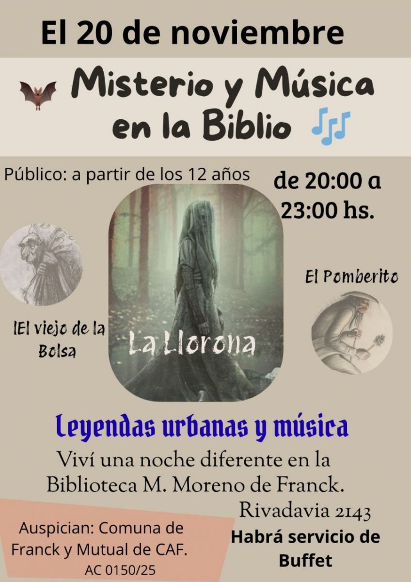 Mañana jueves 20 de 20 a 23 hs. la Biblioteca «Mariano Moreno» de nuestra localidad te invita a una noche diferente para experimentar leyendas urbanas y música.