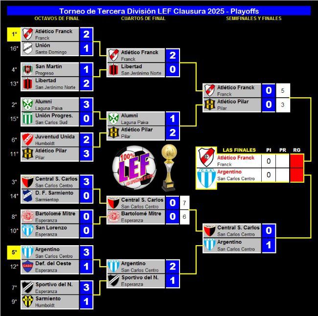 29/11/2025 Liga Esperancina Franck Argentino de San Carlos y Atlético Franck empataron sin goles En la primera final de Tercera división por el Torneo Clausura de Liga Esperancina de Fútbol jugaron en San Carlos Centro Argentino y Atlético Franck. Empataron 0 a 0. El próximo viernes 5 se define en el «Germán Lauxmann«. LEF Tercera Clausura - CAASCC vs CAF - Final Ida LEF Tercera Clausura - CAASCC vs CAF - Final Ida LEF Tercera Clausura - CAASCC vs CAF - Final Ida Anterior Siguiente