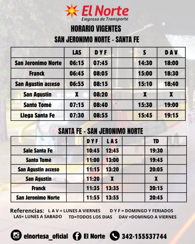 La empresa de transporte «El Norte» informa que estos serán los horarios vigentes durante el mes de Marzo 2026.