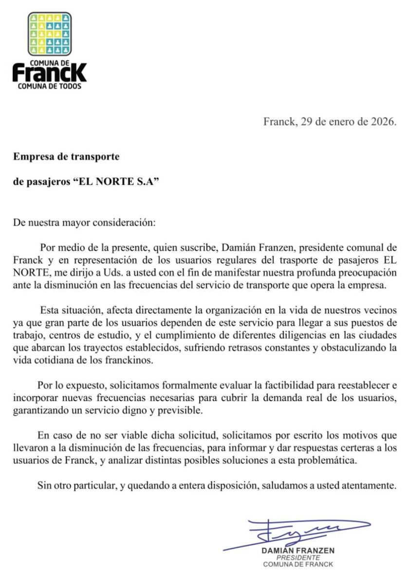 En virtud de la preocupación de nuestros vecinos por la disminución en las frecuencias del servicio de transporte de la empresa El Norte, elevamos nota a la empresa para analizar la situación y solicitar restablecer la normalidad en el servicio en beneficio de los usuarios franckinos.